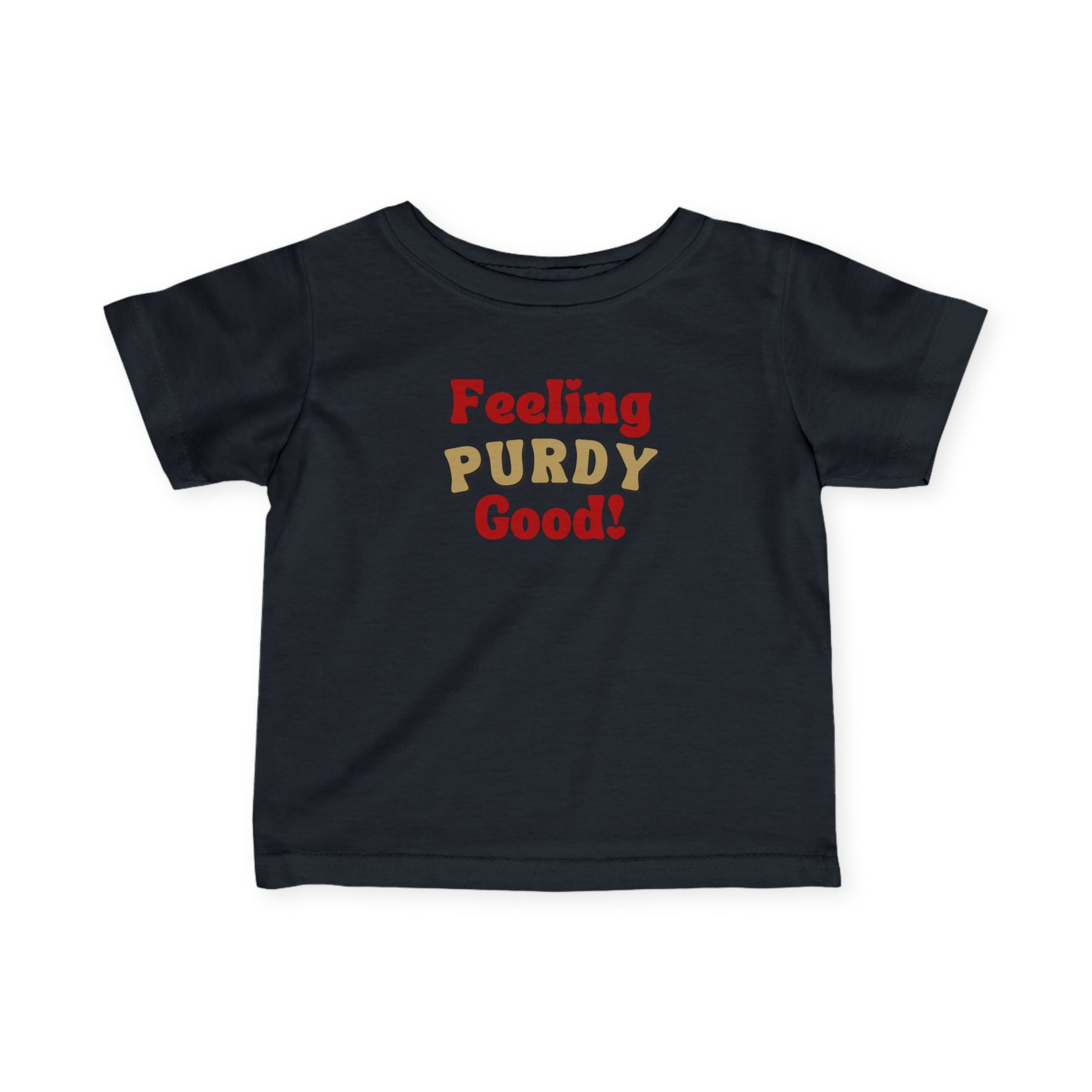 Game day just got way cuter! This âFeeling Purdy Goodâ infant tee is made for the tiniest Brock Purdy fans who are ready to cheer in style. Soft, comfy, and oh-so-adorable, itâs the perfect tee for your little one! Made with 100% combed ringspun cotton, these tees are ultra-soft, lightweight, and gentle on delicate skinâperfect for everyday wear. Designed with a ribbed crew neck and reinforced three-snap closure for easy dressing and diaper changes.