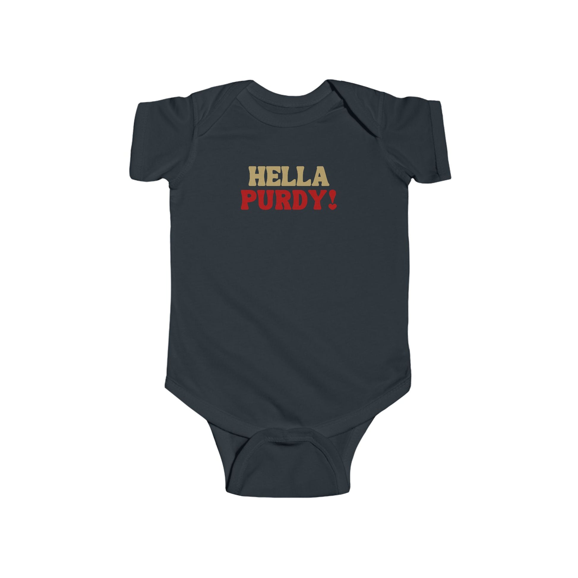 Game day just got way cuter! This âHella Purdyâ infant bodysuit onesie is made for the tiniest Brock Purdy fans who are ready to cheer in style. Soft, comfy, and oh-so-adorable, itâs the perfect bodysuit onesie for your little one! Made with 100% combed ringspun cotton, these tees are ultra-soft, lightweight, and gentle on delicate skinâperfect for everyday wear. Designed with a ribbed crew neck and reinforced three-snap closure for easy dressing and diaper changes.