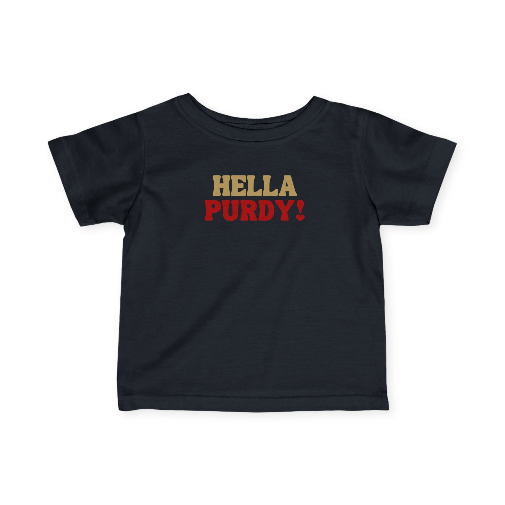 Game day just got way cuter! This âHella Purdyâ infant tee is made for the tiniest Brock Purdy fans who are ready to cheer in style. Soft, comfy, and oh-so-adorable, itâs the perfect tee for your little one! Made with 100% combed ringspun cotton, these tees are ultra-soft, lightweight, and gentle on delicate skinâperfect for everyday wear. Designed with a ribbed crew neck and reinforced three-snap closure for easy dressing and diaper changes.