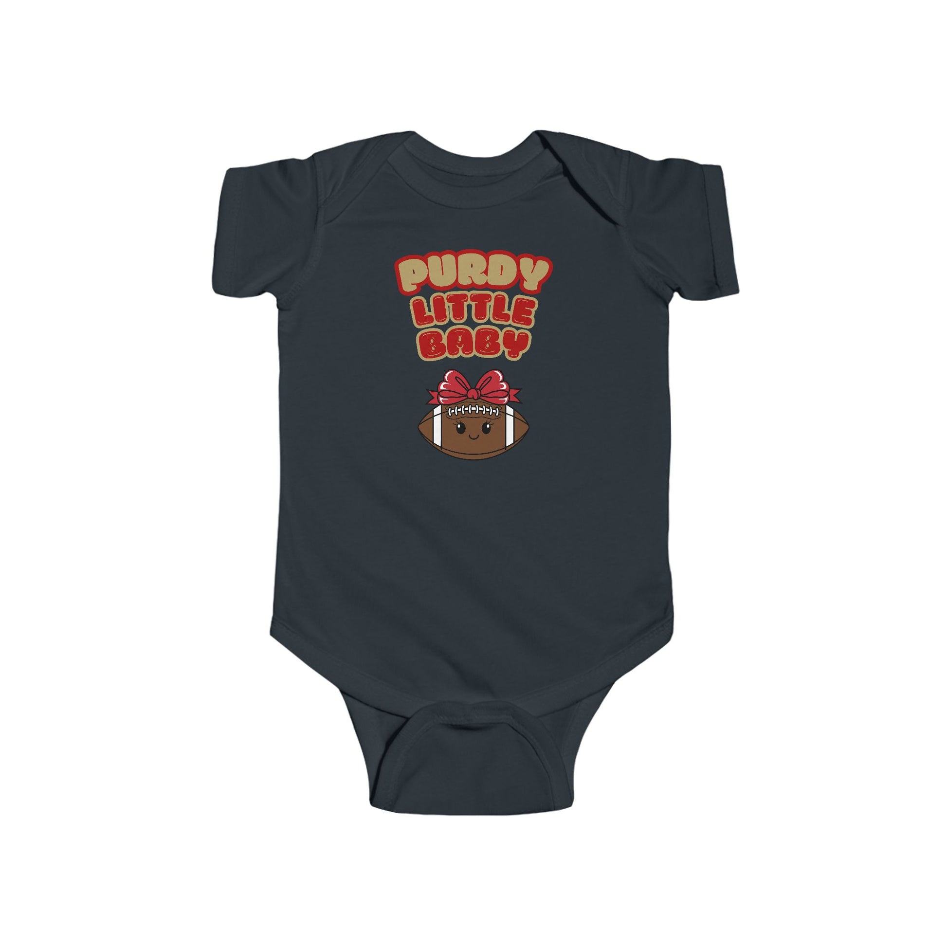 Game day just got way cuter! This âPurdy Little Babyâ infant bodysuit onesie is made for the tiniest Brock Purdy fans who are ready to cheer in style. Soft, comfy, and oh-so-adorable, itâs the perfect bodysuit onesie for your little one! Made with 100% combed ringspun cotton, these tees are ultra-soft, lightweight, and gentle on delicate skinâperfect for everyday wear. Designed with a ribbed crew neck and reinforced three-snap closure for easy dressing and diaper changes.